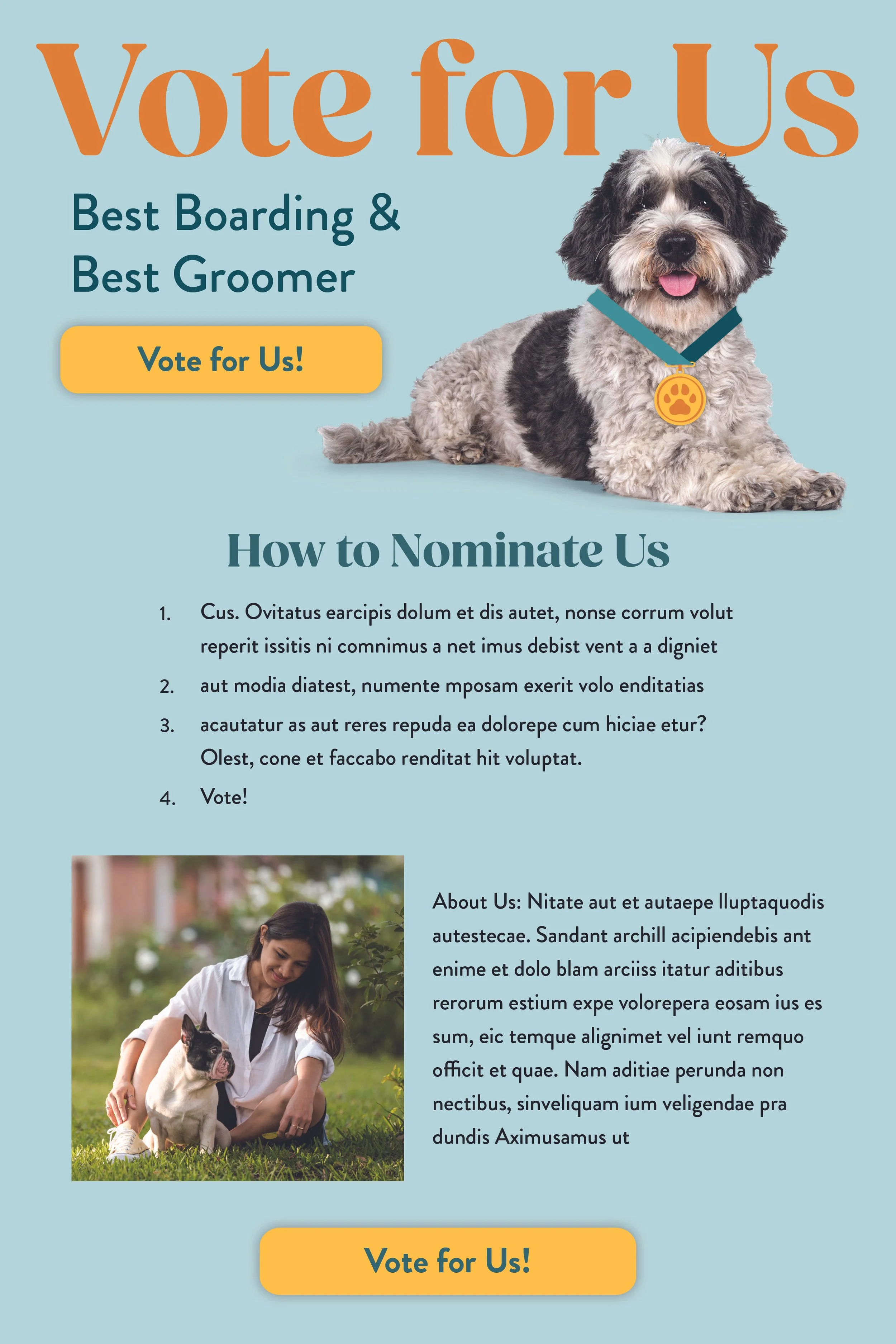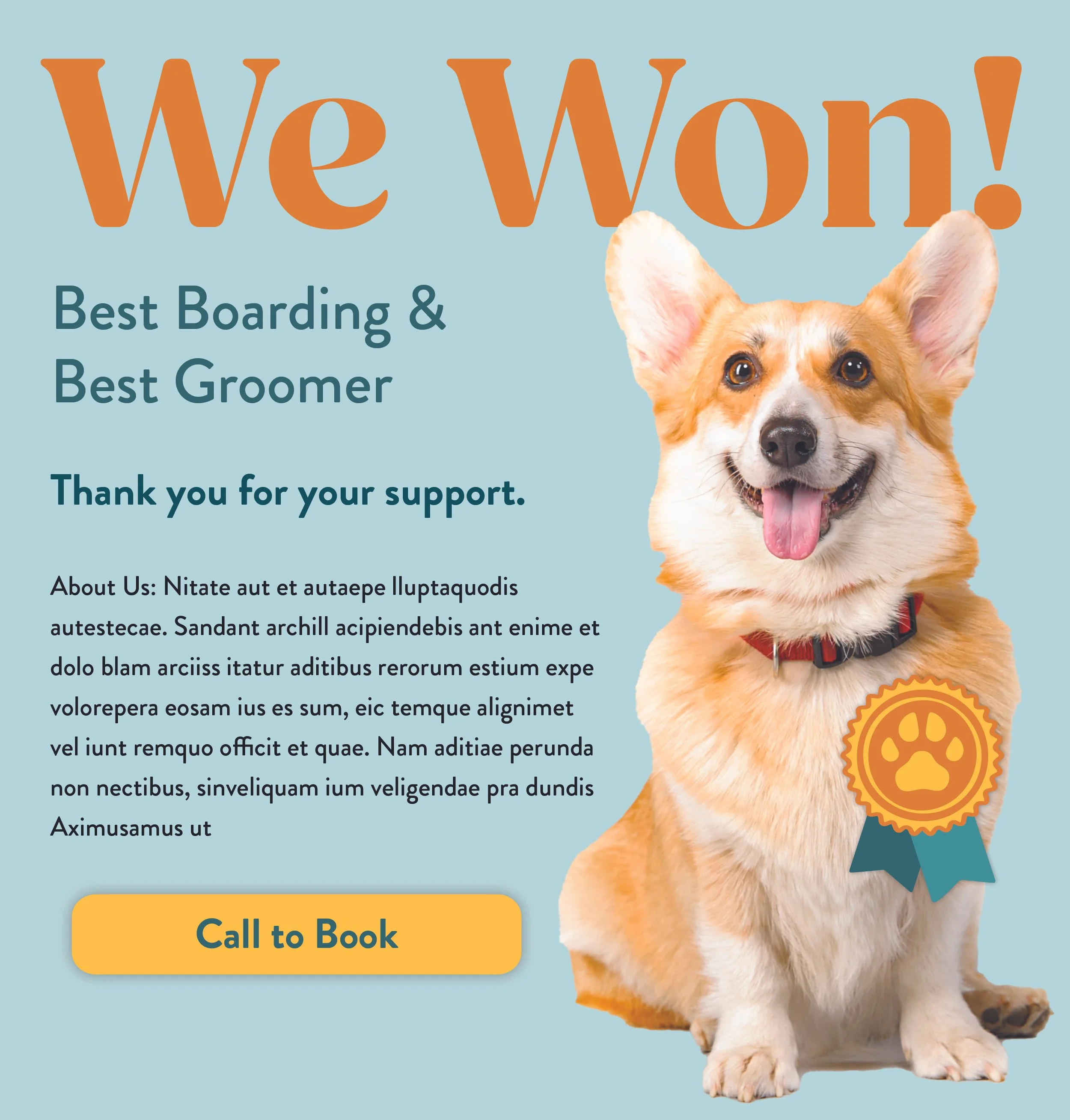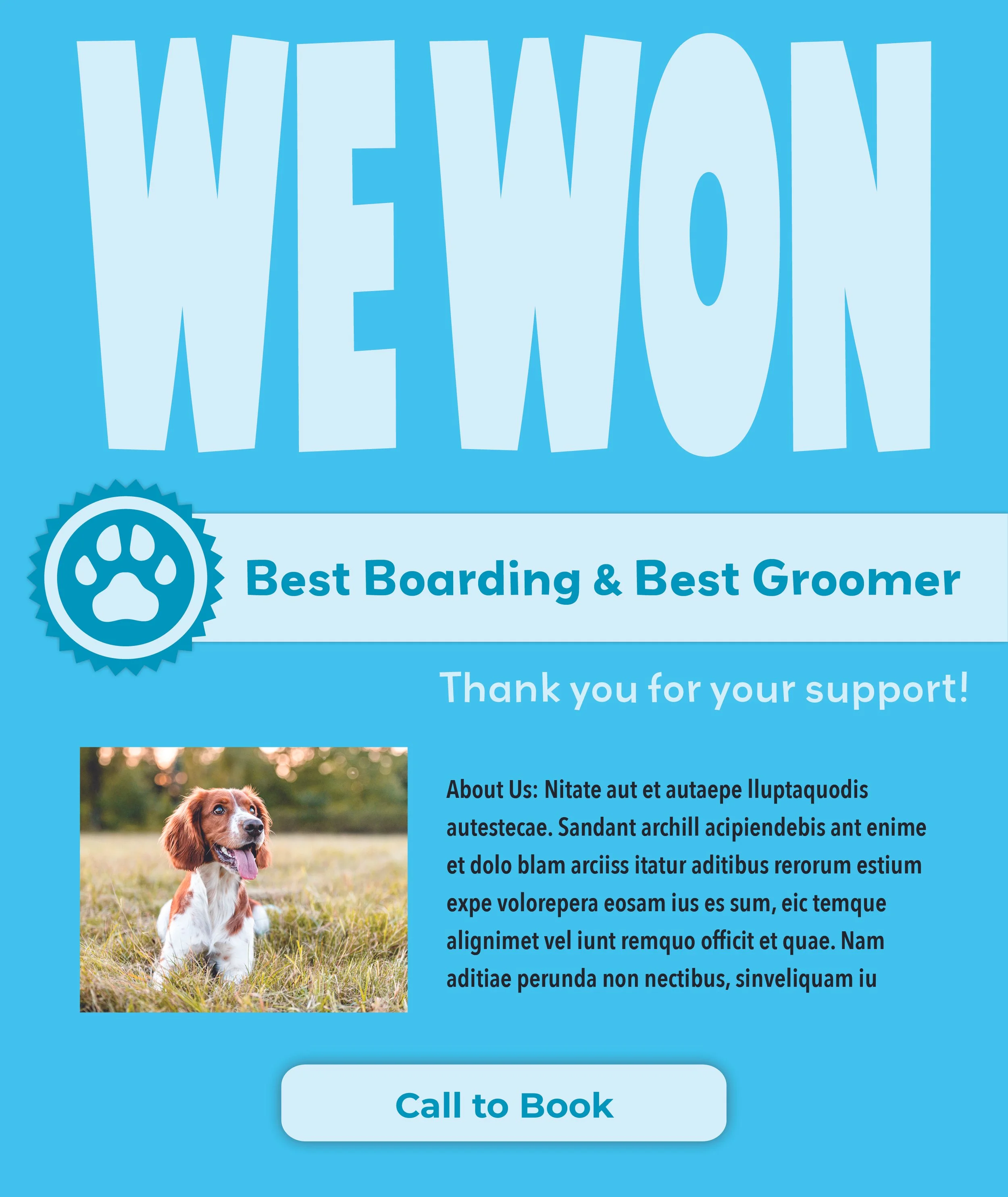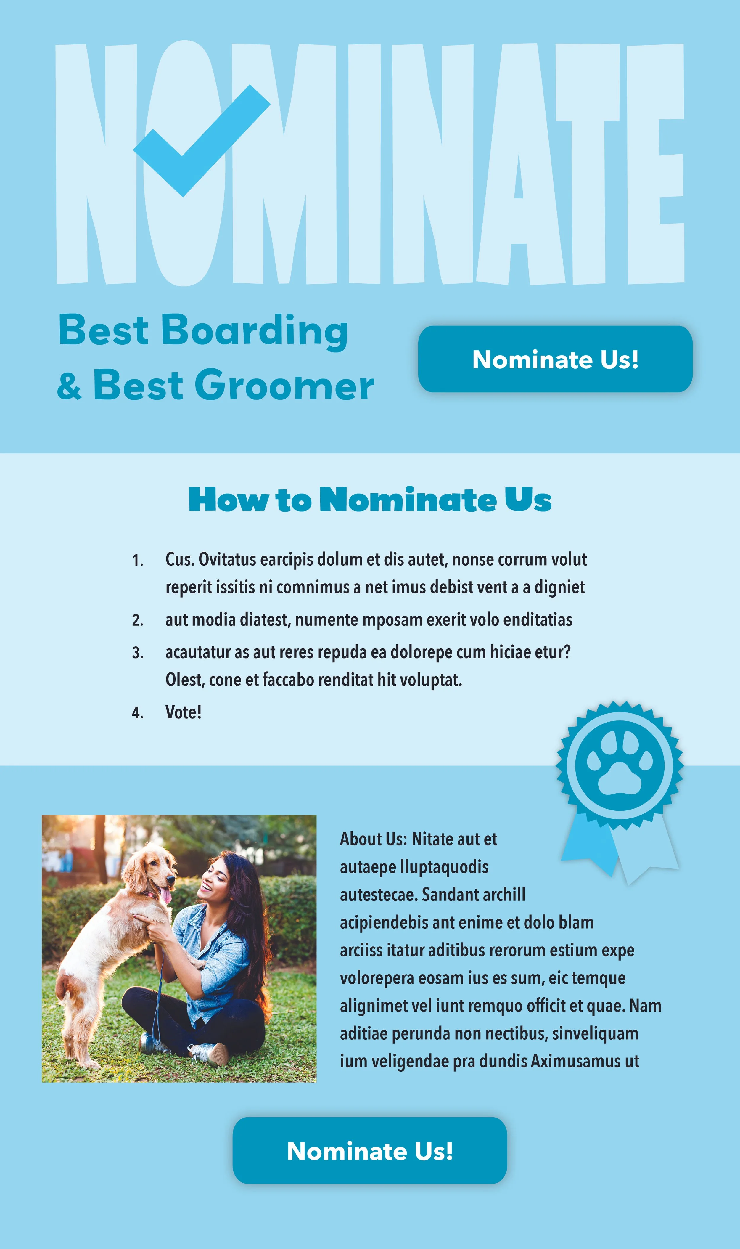 Destination Pet needed a standardized template for local teams to promote regional award nominations and wins via social media and email, ensuring both flexibility and consistency across markets. This project required concept development, collaborating with stakeholders, visual design, and quality assurance, while considering how the templates would need to be adopted for different brands and awards.